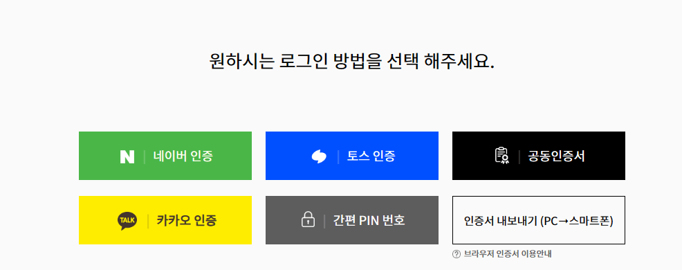 4. 네이버, 토스, 공동인증서, 카카오, 간편 PIN, 인증서 중에서 간편한 방법 택 하여 로그인해 줍니다.