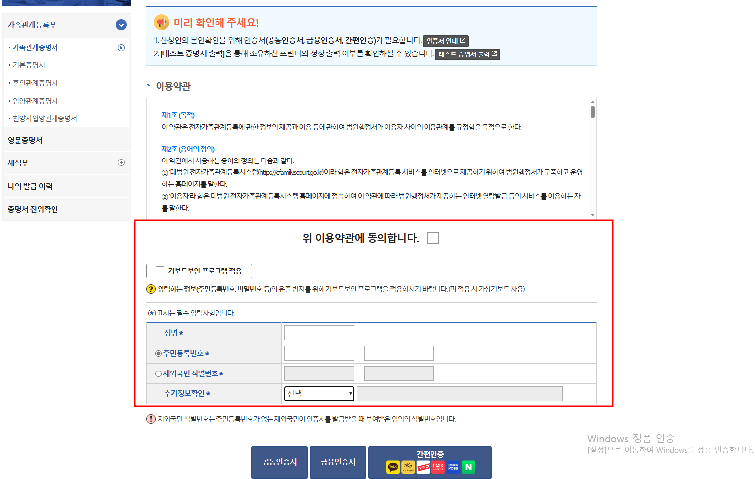 이용약관 동의 체크 후 성명, 주민등록번호, 추가정보확인(부, 모, 자녀, 배우자) 입력해 주시면 됩니다. 입력 후, 본인확인이 필요한데 공동인증서나 금융인증서, 간편 인증 중 하나만 인증받아주시면 됩니다.